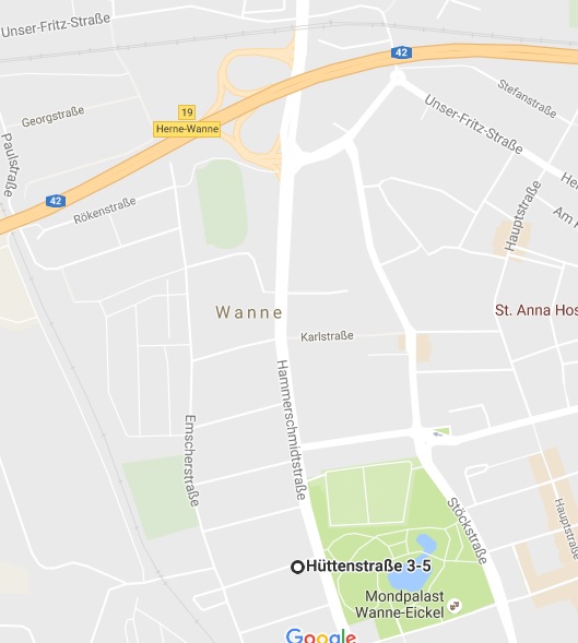 Von der A 42 Richtung Dortmund die Abfahrt Wanne nehmen und rechts abbiegen auf die Hammerschmidtstraße und rechts in die 5. Straße Hüttenstr. abbiegen.